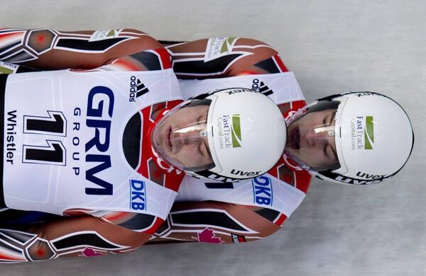 Canada's Tristan Walker and Justin Snith race during the men's luge at the 44th FIL World Championships at the Whistler Sliding Centre in Whistler, B.C. Friday, February, 1, 2013.JONATHAN HAYWARD/The Canadian Press