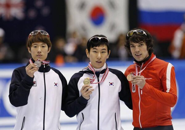 Silver medalist Sin Da-woon (L-R) and gold medalist Kim Byeong-jun from South Korea pose with bronze medalist Charles Hamelin from Canada after the men's 1,500 meter final during the ISU Short Track World Cup competition in Nagoya, central Japan, December 1, 2012.KIM KYUNG-HOON/Reuters