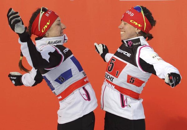 Perianne Jones (right) of Almonte, Ont. and Dara Gaiazova of Banff, Alberta do a chest bump before accepting the bronze medal in team sprint competition at a FIS cross country World Cup and Sochi Olympics test event in Sochi, Russia, Sunday, Feb. 3, 2013.Mike Ridewood/The Canadian Press