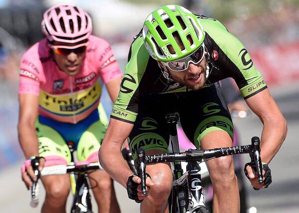 Ryder Hesjedal of Canada crosses the finish line ahead of Aberto Contador at the end of the18th stage of the Giro d'Italia, Tour of Italy cycling race May 28, 2015.Daniel Dal Zennaro/The Associated Press