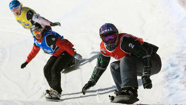 Lindsey Jacobellis of the U.S. takes first place, while Dominique Maltais of Canada, bak left, takes third during the FIS Snowboard World Championships men's and women's snowboardcross Tuesday in La Molina, Spain.Christophe Pallot/Agence Zoom