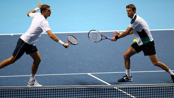 Daniel Nestor of Canada, right, returns the ball next to Max Mirnyi of Belarus during their men's doubles first round match against Rohan Bopanna of India and Aisam-Ul-Haq Qureshi of Pakistan during the Barclays ATP World Tour Finals at the O2 Arena on Sunday in London, England.Clive Brunskill