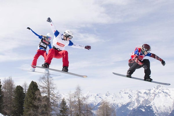 Chloe Trespeuch of France, Nelly Moenne Loccoz of France and Dominique Maltais of Canada, from left, in action during the women's World Cup Snowboard Cross, BigFinal, in Veysonnaz, Switzerland, Tuesday, March 11, 2014.Anthony Anex/The Associated Press