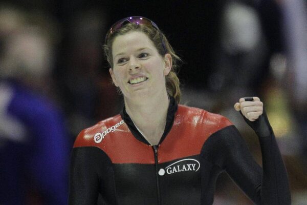 Christine Nesbitt of Canada celebrates winning the women's 1500 metres race at the World Single Distances Speed Skating Championships at Thialf stadium in Heerenveen, northern Netherlands, Friday March 23, 2012.Peter Dejong/The Associated Press