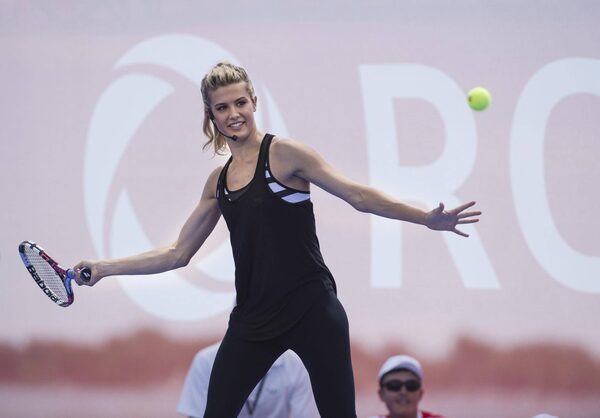 Eugenie Bouchard returns a shot during an exhibition match on a tennis court atop a barge docked on Lake Ontario in TorontoAaron Vincent Elkaim/The Canadian Press