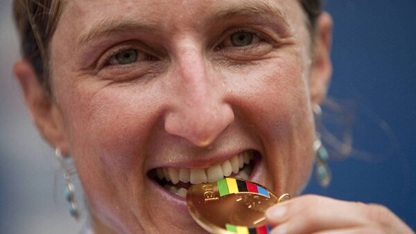 Catharine Pendrel from Canada celebrates with her gold medal after wining the women's cross country event at the UCI Mountain Bike World Championships in Champery, September 3, 2011. REUTERS/Valentin FlauraudValentin Flauraud/Reuters