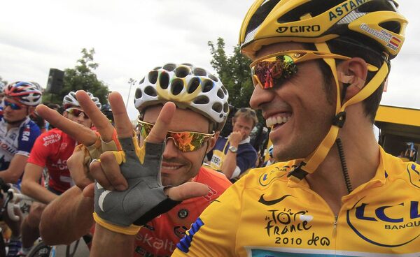 Samuel Sanchez of Spain, rear, adds two more fingers as Alberto Contador of Spain, wearing the overall leader's yellow jersey, flashes three fingers for his third Tour victory during the 20th and last stage of the Tour de France cycling race over 102.5 kilometers (63.7 miles) with start in Longjumeau and finish in Paris, France, Sunday, July 25, 2010. (AP Photo/Christophe Ena)Christophe Ena/The Associated Press