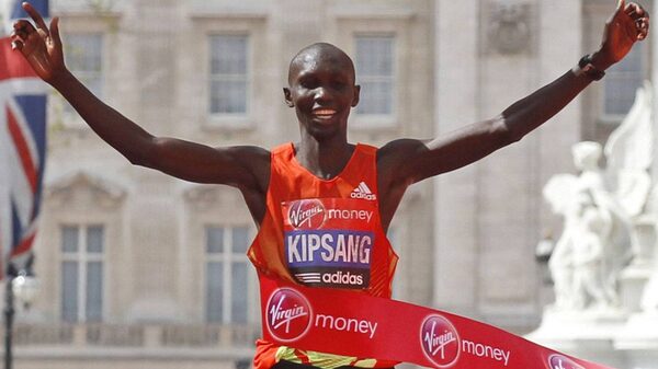 Kenya's Wilson Kipsang celebrates his win as he crosses the finish line during the London Marathon, London, Sunday, April 22, 2012. Kenya's marathon superiority was flaunted Sunday ahead of the Olympics, with Wilson Kipsang and Mary Keitany coasting to victory in London to virtually assure themselves of selection for the games. (AP Photo/Sang Tan)Sang Tan/The Associated Press