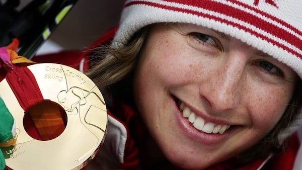 Canada's Chandra Crawford presents her gold medal after winning the women's sprint cross-country skiing race at the Torino 2006 Winter Olympic Games in Pragelato, Italy, February 22, 2006.Reuters