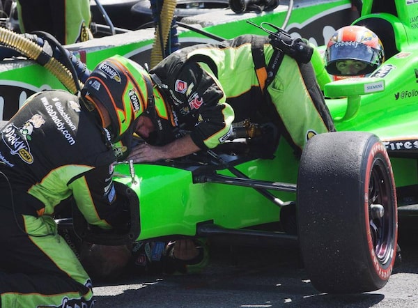 James Hinchcliffe, of Canada, sits in the pits as his crew works on his car as he gets a late start out of the pits after he didn't participate in the standing start due to technical problems at the Toronto Indy race in Toronto on Sunday July 14 , 2013.Mark Blinch/The Canadian Press