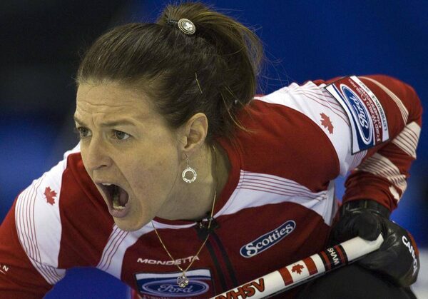 Canada skip Heather Nedohin shouts to teammates to sweep during their game against Russia at the World Women's Curling Championships in Lethbridge, Alberta March 20, 2012.ANDY CLARK/Reuters