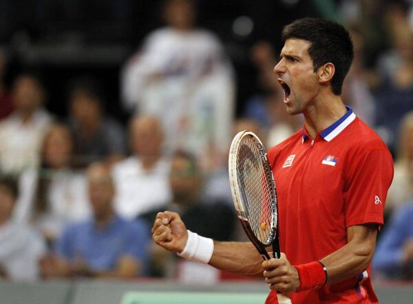 Novak Djokovic of Serbia celebrates a point won against Milos Raonic of Canada during their Davis Cup semifinal match in Belgrade, Serbia, Sunday, Sept. 15, 2013.Darko Vojinovic/The Associated Press