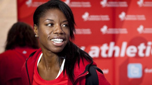 Perdita Felicien smiles at a news conference highlighting the Canadian Track and Field Championships and Olympic Trials in Calgary, Alta., Tuesday, June 26, 2012.The Canadian Press
