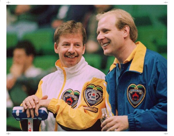 Manitoba skip Vic Peters (left) and Alberta skip Kevin Martin chat between ends at the morning draw of the Labatt Brier in Calgary, March 11, 1997.The Canadian Press