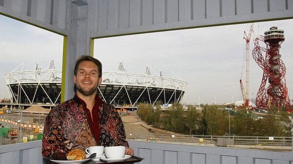 In this photo taken Monday, Oct. 24, 2011, Tom Seaton, owner of The Container Cafe, poses for a photograph at his business near the Olympic Park in Stratford, London. You would think Tom Seaton would be sitting pretty right now, given that his cafe offers an almost-touch-it view of London's Olympic stadium. But Seaton and other small business owners who work in the five London boroughs hosting the 2012 Olympics are mostly worried. Businesses in east London are likely to face severe disruption during the games that will take place on their doorstep.Kirsty Wigglesworth/The Associated Press