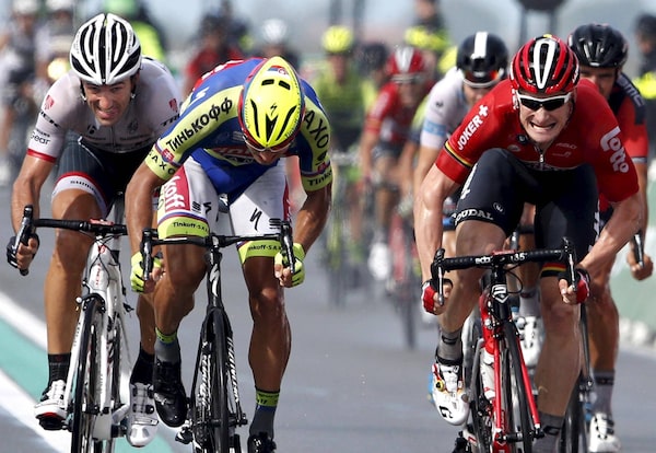 Andre Greipel, right, sprints ahead of Peter Sagan. Sunday’s course, which took the riders along the Dutch coastline toward the heart of the Zeeland Delta, proved treacherous as heavy winds and driving rain caused splits throughout the field.ERIC GAILLARD/Reuters