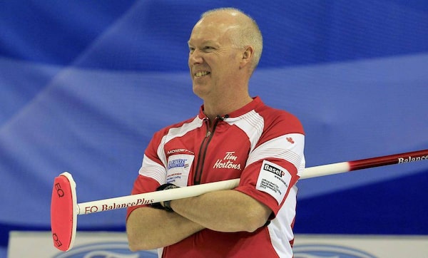 Skip Glenn Howard smiles during play at the World Men's Curling Championship 2012 in Basel April 4, 2012.ARND WIEGMANN/Reuters