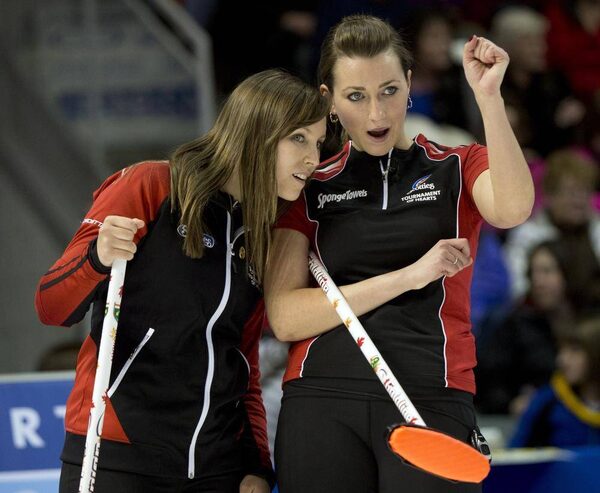 Ontario skip Rachel Homan, left, and Emma Miskew watch a shot during the page playoff curling action against Manitoba at the Scotties Tournament of Hearts Saturday, February 23, 2013 in Kingston, Ont..Ryan Remiorz/The Canadian Press