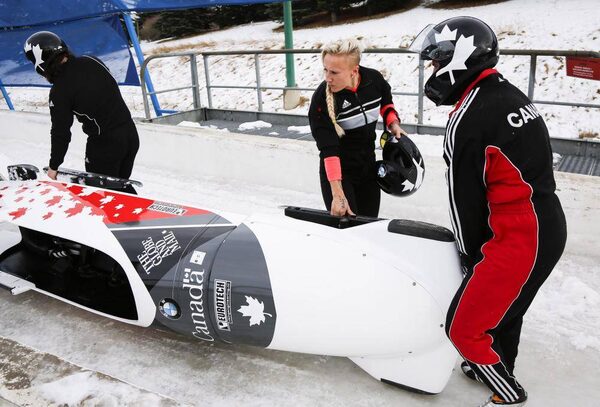 Bobsled pilot Kaillie Humphries helps move her sled with her male teammates following a training run at Canada Olympic Park in CalgaryJeff McIntosh/The Canadian Press