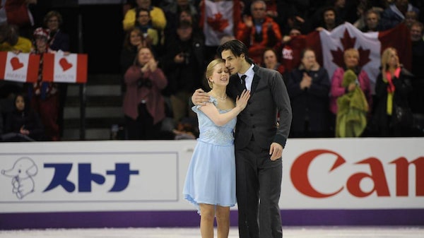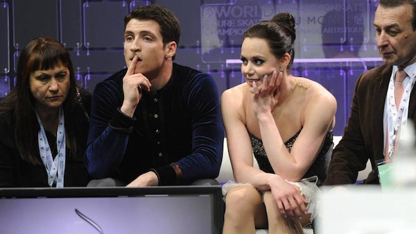 Canadians Tessa Virtue and Scott Moir react to their score following their performance in the ice dance short dance at the ISU World Figure Skating Championships 2013 in London, Ont. Thursday, March 14, 2013.Kevin Van Paassen/The Globe and Mail