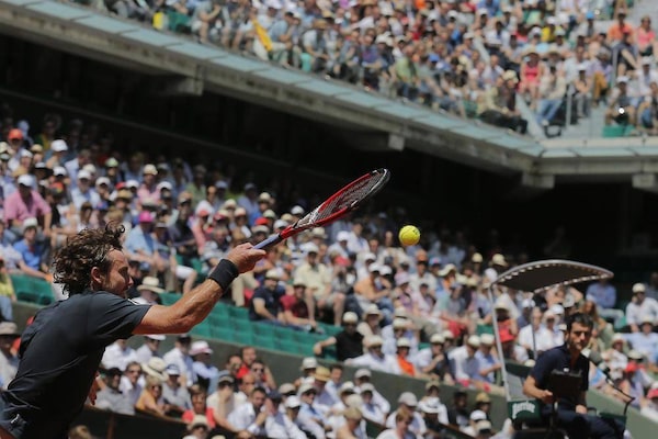 Latvia's Ernests Gulbis returns the ball during the semi-final match of the French Open tennis tournament against Serbia's Novak Djokovic at the Roland Garros stadium, in Paris, France, Friday, June 6, 2014.Darko Vojinovic/The Associated Press