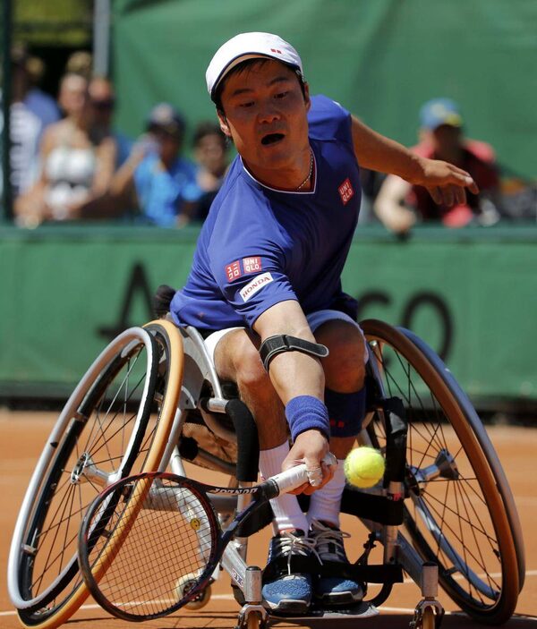 Shingo Kunieda of Japan returns the ball to Stephane Houdet of France during their wheelchair tennis men's final match against at the French Open Tennis tournament at the Roland Garros stadium in Paris June 6, 2014.STEPHANE MAHE/Reuters