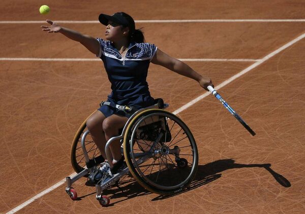 Yui Kamiji of Japan serves to Aniek van Koot of the Netherlands during their wheelchair tennis women's final match at the French Open Tennis tournament at the Roland Garros stadium in Paris June 6, 2014.GONZALO FUENTES/Reuters