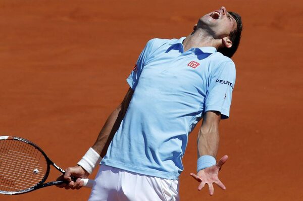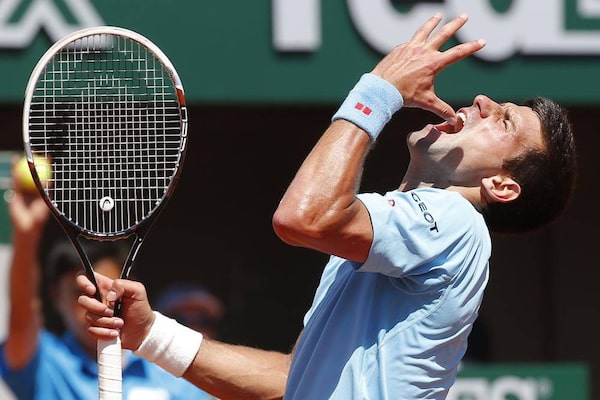 Novak Djokovic of Serbia reacts during his men's semi-final match against Ernests Gulbis of Latvia at the French Open tennis tournament at the Roland Garros stadium in Paris June 6, 2014.JEAN-PAUL PELISSIER/Reuters