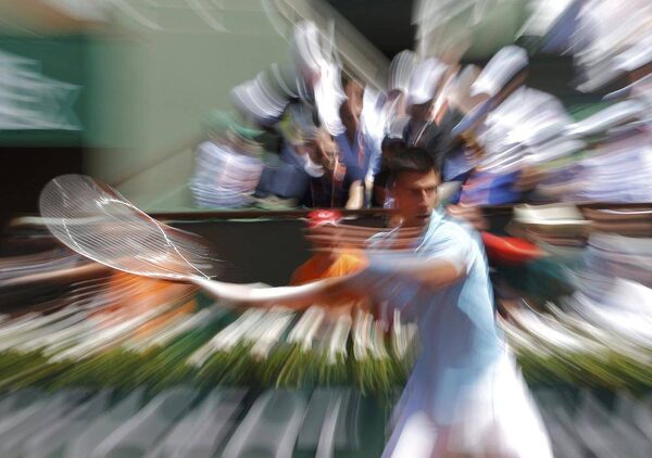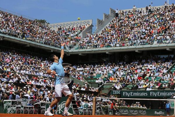 Novak Djokovic of Serbia returns the ball to Ernests Gulbis of Latvia during their men's semi-final match at the French Open tennis tournament at the Roland Garros stadium in Paris June 6, 2014. Picture taken with zoom-out effect.STEPHANE MAHE/Reuters