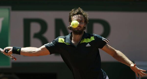 Latvia's Ernests Gulbis returns the ball during the semi-final match of the French Open tennis tournament against Serbia's Novak Djokovic at the Roland Garros stadium, in Paris, France, Friday, June 6, 2014.David Vincent/The Associated Press