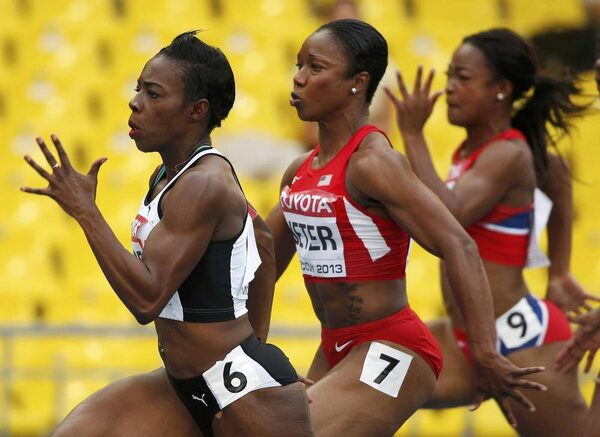 Carmelita Jeter of the U.S. (C) runs between Murielle Ahoure of Ivory Coast (L) and Ezinne Okparaebo of Norway in their women's 100 metres semi-final during the IAAF World Athletics Championships at the Luzhniki stadium in Moscow August 12, 2013.DOMINIC EBENBICHLER/Reuters
