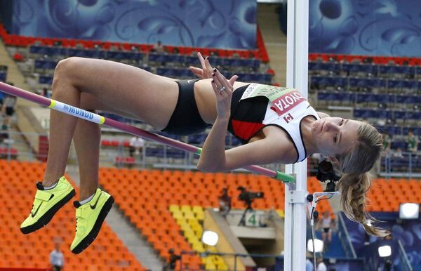 Canada's Brianne Theisen Eaton competes in the high jump in the heptathlon at the World Athletics Championships in the Luzhniki stadium in Moscow, Russia, Monday, Aug. 12, 2013.Matt Dunham/The Associated Press