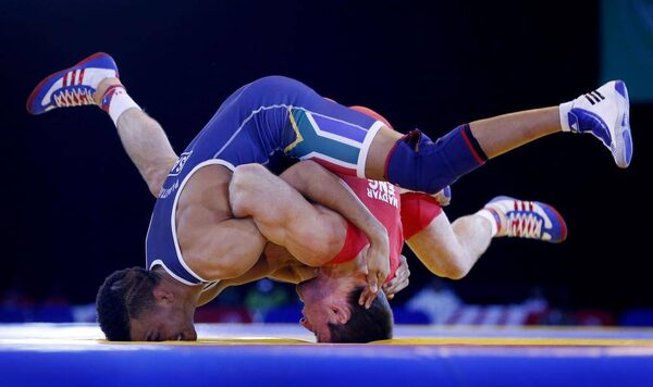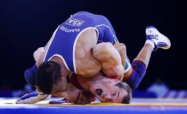 England's Sasha Madyarchyk, foreground, and South Africa's Marno Plaatjies challenge during the 61kg Repechage Wrestling at the Commonwealth Games 2014, in Glasgow, Wednesday July 30, 2014.Danny Lawson/The Associated Press