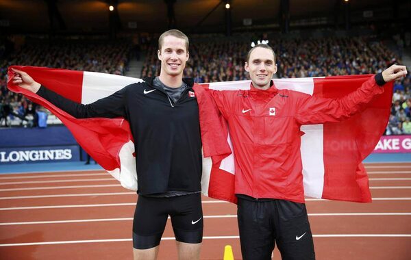 Derek Drouin of Canada, left, poses after finishing first place in the men's high jump with compatriot and third-place finisher Michael Mason following the final at the 2014 Commonwealth Games in Glasgow, Scotland, July 30, 2014.SUZANNE PLUNKETT/Reuters