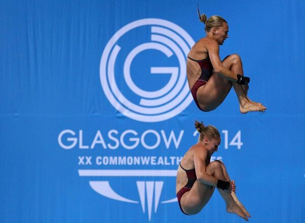 England's Tonia Couch top, and Sarah Barrow dive during the women's synchronized 10-metre platform event in Edinburgh, during the Commonwealth Games 2014, Wednesday July 30, 2014.Andrew Milligan/The Associated Press