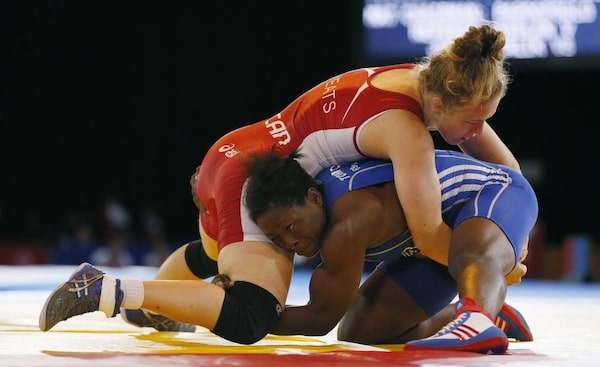 Dori Yeats of Canada, in red on top, grapples with Angele Tomo of Cameroon during their gold medal women's 69 kg wrestling bout at the Commonwealth Games Glasgow 2014, in Glasgow, Scotland, Wednesday, July, 30, 2014.Alastair Grant/The Associated Press