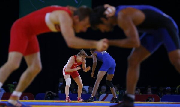 Sasha Madyarchyk of England, front left, grapples with Bajrang Bajrang of India during their men's freestyle 61kg wrestling match, as Jill Gallays of Canada, back left, tussles with Odunayo Adekuoroye of Nigeria during their women's freestyle 53kg quarter-final at the 2014 Commonwealth Games in Glasgow, Scotland, July 30, 2014.PHIL NOBLE/Reuters