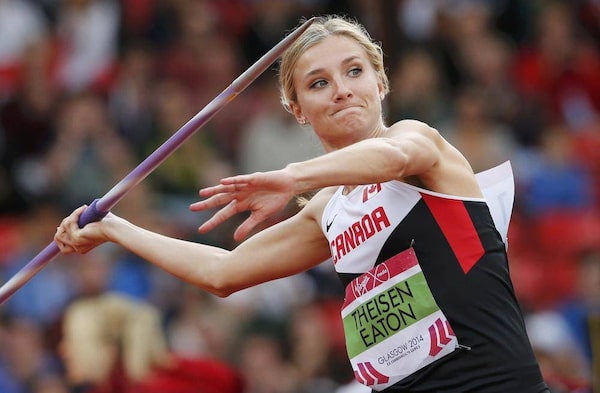 Brianne Theisen-Eaton of Canada competes in the women's heptathlon javelin throw at the 2014 Commonwealth Games in Glasgow, Scotland, July 30, 2014.SUZANNE PLUNKETT/Reuters