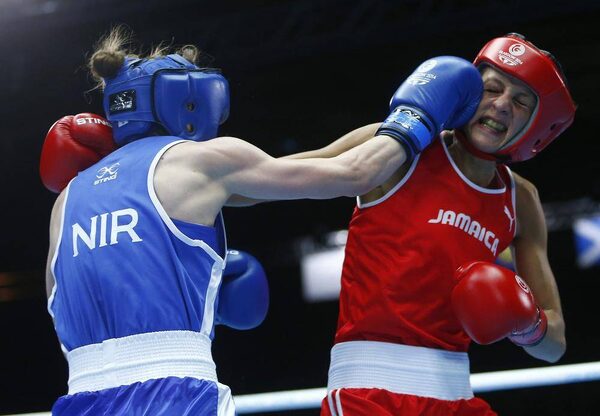 Sarah Joy Rae, right, of Jamaica and Michaela Walsh of Northern Ireland box during their women's flyweight quarter-final bout at the 2014 Commonwealth Games in Glasgow, Scotland, July 30, 2014.ANDREW WINNING/Reuters