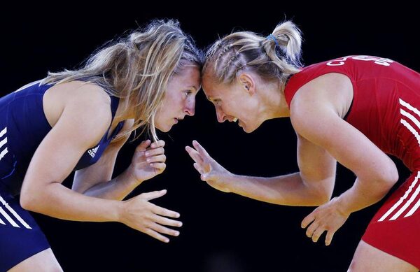 Scotland's Jayne Clason, right, and Scotland's Shannon Hawke challenge during the 53kg wrestling quarter-finals, at the Commonwealth Games 2014, in Glasgow, Wednesday July 30, 2014.Danny Lawson/The Associated Press
