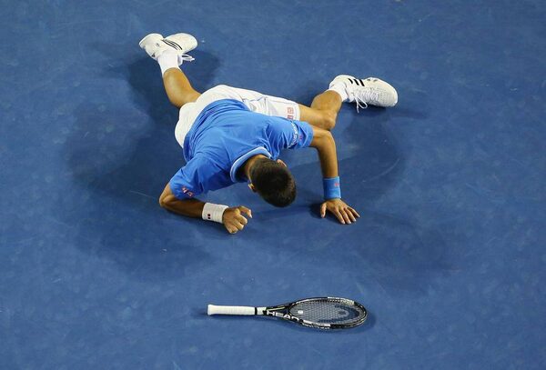 Novak Djokovic slips and falls over as he chases the ball in his quarter-final match against Milos Raonic.Scott Barbour/Getty Images