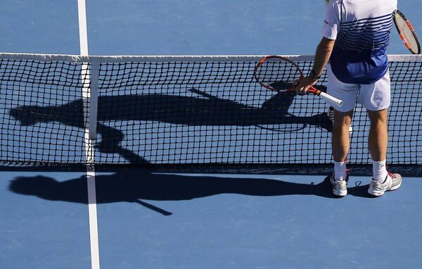 The shadows of Kei Nishikori (top) of Japan and Stan Wawrinka of Switzerland are seen as they shake hands after Nishikori was defeated in their men's singles quarter-final match at the Australian Open.CARLOS BARRIA/Reuters