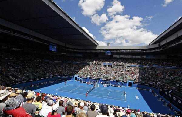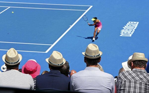 Spectators wearing hats watch as Madison Keys of the U.S. hits a return to compatriot Venus Williams during their women's singles quarter-final match at the Australian Open.BRANDON MALONE/Reuters