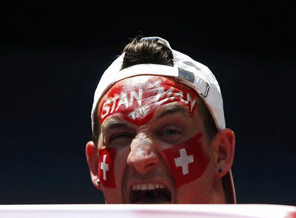 A supporter of Stan Wawrinka of Switzerland yells as he plays Kei Nishikori of Japan in their men's singles quarter-final match at the Australian Open.BRANDON MALONE/Reuters