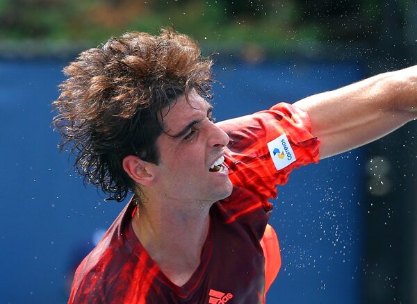 Thomaz Bellucci of Brazil serves to Yoshihito NishiokaJerry Lai