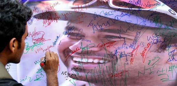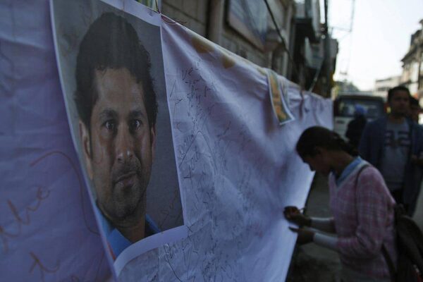 A fan of Indian cricketer Sachin Tendulkar writes a message on Tendulkar's poster displayed during an event organized by a non-governmental organization for the blind in Bangalore, India, Wednesday, Nov. 13, 2013.Aijaz Rahi/The Associated Press