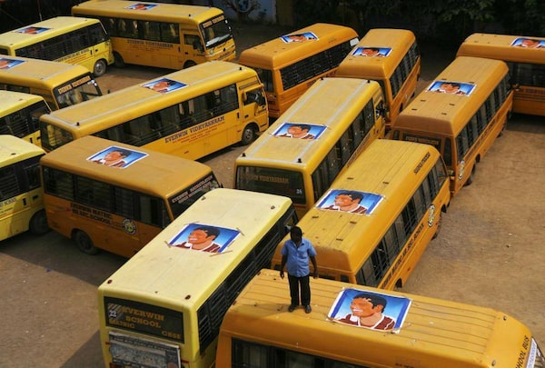 A staff member stands on top of a parked school buses after taping posters of Indian cricketer Sachin Tendulkar as students gather to honour him in Chennai, India, Thursday, Nov. 14, 2013.Arun Sankar K/The Associated Press