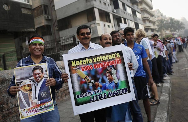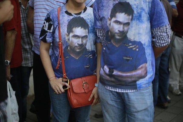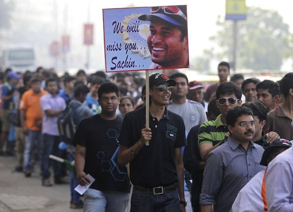 Supporters wearing T-shirts with pictures of Indian cricketer Sachin Tendulkar stand in a queue to watch his last test match in Mumbai, India, Thursday, Nov. 14, 2013.Rafiq Maqbool/The Associated Press