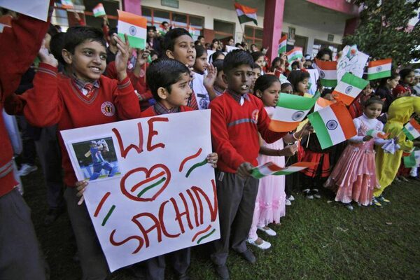 Indian school children wave Indian flags and display placards of Indian cricketer Sachin Tendulkar as they gather to honour him in Jammu, India, Thursday, Nov. 14, 2013.Channi Anand/The Associated Press