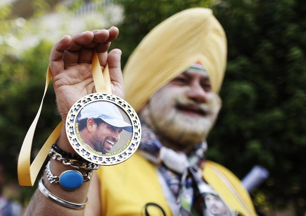 A cricket fan holds a medal with a portrait of cricketer Sachin Tendulkar while posing for photographers outside a stadium in Mumbai November 14, 2013.DANISH SIDDIQUI/Reuters